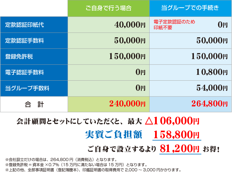 株式会社にかかる費用は以下の通りですが、電子認証定款だけをプロに委託した場合、定款印紙代40,000円は不要となりますが、手数料が数万円かかるとみてください。