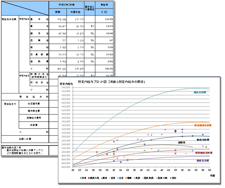 「人事賃金制度診断」によって、自社の賃金水準や昇給額等が業績に対して適正であるか、また、同業者と比較した際にどの水準にあるかを把握することができます。
